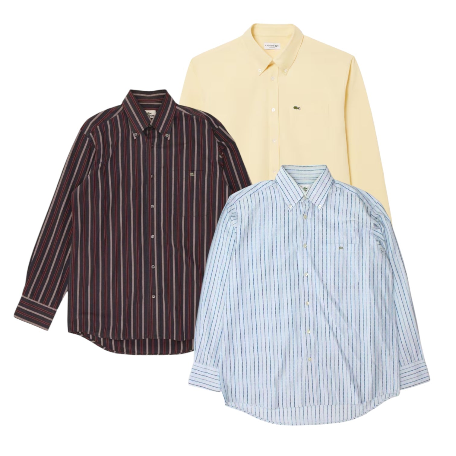 Las camisas Lacoste serán de manga larga. Los estilos incluyen bloques de color, rayas, cuadros, estampados, etc. Todas son grandes generadoras de beneficios y ventas constantes durante todo el año.